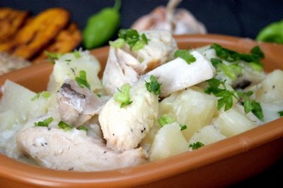 Na panela coloque o azeite e o alho picado e deixe fritar um pouco. Em seguida faça o mesmo com os cubos de pintado. Acrescente a mandioca pré-cozida com sal e cortada em pedaços e água suficiente para cobrir tudo.